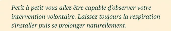 Vous suivez le flux de l’air, qui rentre à l’inspiration, et qui sort à l’expiration. Vous allez maintenant, à chaque respiration, prolonger un tout petit peu l’expiration, vous repousser tranquillement, le nombril vers la colonne, et vous laisser venir l’inspiration, vous là se laisser déployer complètement sans intervenir. À chaque cycle respiratoire on expire un petit peu plus, toujours sur une respiration complète: le ventre rentre, la poitrine s’affaisse et on laisse le nombril venir vers la colonne. On laisse rentrer l’inspiration: le ventre reprend sa place, les côtes s’écartent et la poitrine se soulève. Expire, on intervient à la fin de l’expiration pour la prolonger et on laisse venir l’inspiration; on la laisse se déployer. Et chaque cycle respiratoire, on prolonge un peu plus l’expiration, on vide bien tout l’air des poumons, toujours en restant dans une zone de confort sans rien forcer. Le visage est détendu, la mâchoire desserrée. On va maintenant intervenir sur l’inspiration, on va laisser se faire, on va la ralentir, on laisse se déployer main avec un débit moins important. On laisse l’air rentrer en contrôlant cette entrée d’air, on a donc une respiration complète, on pousse bien le nombril vers la colonne et on laisse venir l’inspiration: le ventre reprend sa place, les côtes s’écartent et la poitrine se soulève de plus en plus lentement et quand c’est le moment on expire (on ne force rien !). Toujours détendue ! Et au moment de l’inspiration, toujours avec un débit très lent, on ouvre un peu plus les narines, afin d’avoir une respiration lente, profonde et ample. À l’expiration, on vide bien tout l’air très lentement. On contrôle le débit de l’inspiration et de l’expiration. Ainsi, que l’amplitude de la respiration. On a maintenant une respiration lente, ample et continue. L’inspiration et l’expiration se font toujours par le nez et on suit le flux de l’air qui rentre et qui ressort lentement et régulièrement, de manière continue… A l’inspiration, comme à l’expiration. Vous laissez maintenant la respiration se faire sans intervenir.