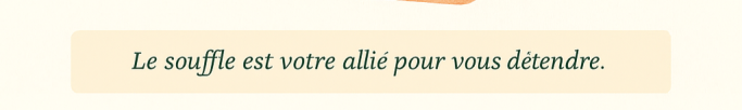Porter l’attention sur votre respiration, vous suivez le flux de l’air qui rentre et qui sort, tranquillement juste en observateur et peu à peu à chaque cycle respiratoire vous allez réduire le débit de l’expiration. L’amplitude reste la même, et on diminue le débit, si cela vous facilite les choses vous pouvez expirer par la bouche comme si vous soufflez dans une paille. On laisse ensuite l’inspiration venir tranquillement, et se déployer complètement, on inspire par le nez. On va maintenant faire une respiration rythmée, on compte le temps d’inspiration: 1, 2, 3, 4 et d’expiration 1, 2, 3, 4 et on reste dans ce rythme régulier. Maintenant on va allonger le temps d’expiration: on inspire 1, 2, 3, 4 et on expire 1, 2, 3, 4, 5, 6. On inspire 1, 2, 3, 4 et on expire 1, 2, 3, 4, 5, 6 etc… Vous continuez tranquillement une expiration plus longue que l’inspiration. On augmente encore le temps d’expiration: on inspire 1, 2, 3, 4, et on expire 1, 2, 3, 4, 5, 6, 7, 8. Puis on inspire 1, 2, 3, 4, et on expire 1, 2, 3, 4, 5, 6, 7, 8 et vous continuez tranquillement. Vous allez maintenant laisser la respiration se faire sans intervenir d’aucune manière.